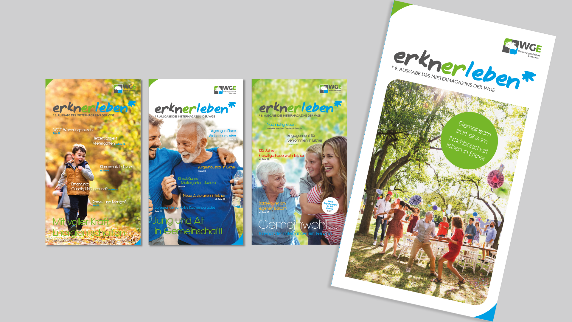 Den Anfang machte das Mietermagazin »erkn(er)leben«. So etwas gab es bisher nicht, so dass graphicsson das Magazin komplett neu – mit freier Hand bei Konzept und Design entwickelte, inkl. Namensgebung. Entstanden ist ein außergewöhnliches Sonderformat im schmalen Hochformat, das sich sofort vom Gewohnten abhebt und bis heute unverwechselbar ist.